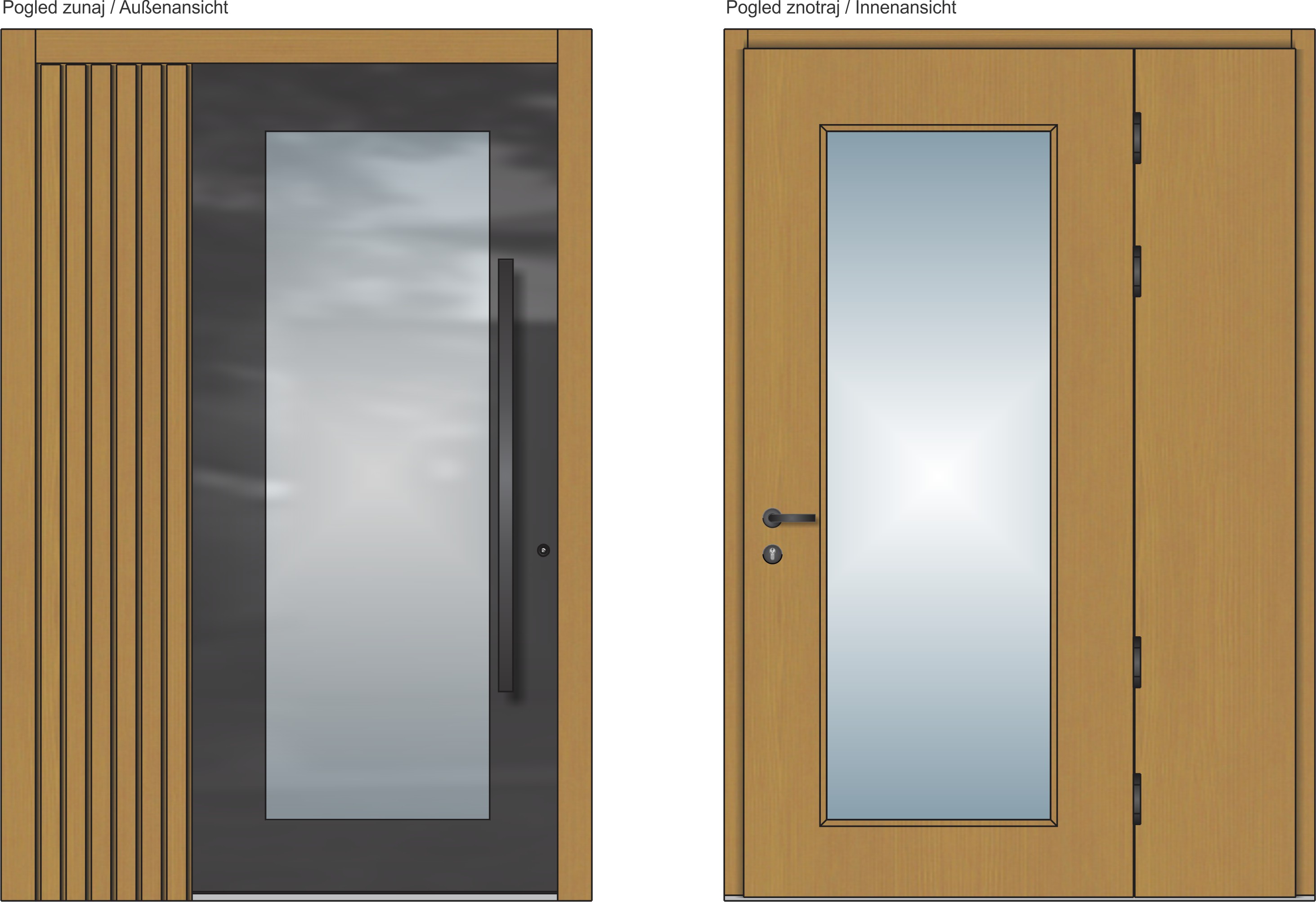 Dargestellte Haustüren und Nebeneingangstüren sind im Werk Bled auf Lager.