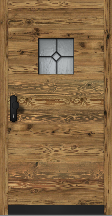 Türblatt ist außen mit 20 mm Stärke Altholz-Applikation überdeckt.